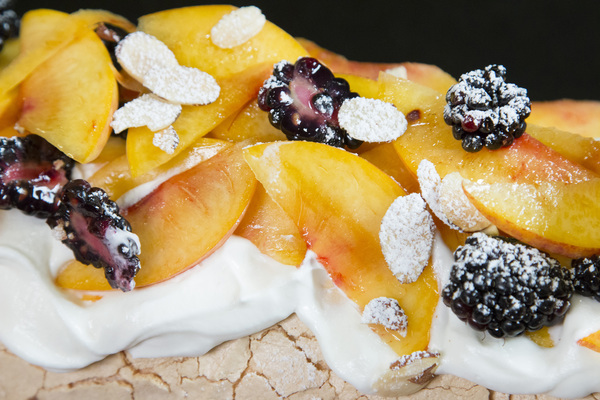 Most often, a pavlova is made as a giant meringue, a Frisbee-sized, free-form confection that's baked, then topped with whipped cream and fruit or whatever's on hand. Ottolenghi and Goh have spread out their meringue on a sheet pan and baked it like a sponge cake, then dropped whipped cream, sliced peaches, blackberries and almonds on top and rolled it up, jelly roll style. The result is showstopping.