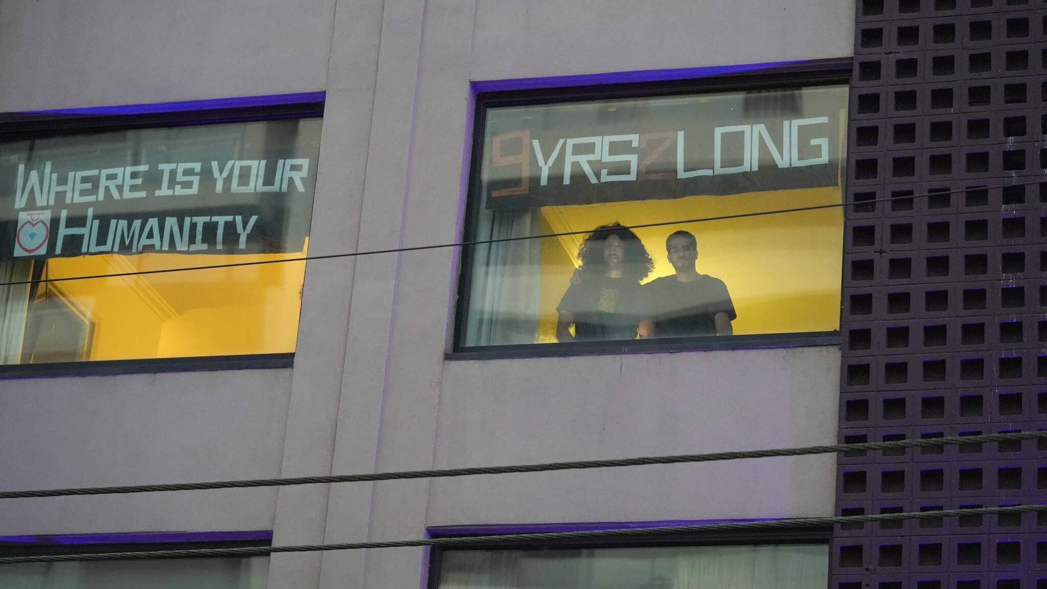 When that didn't work, Mehdi decided he needed to connect with the outside world, so he went out onto the balcony facing the street and held a sign reading, "Let us free. 7 years too long".