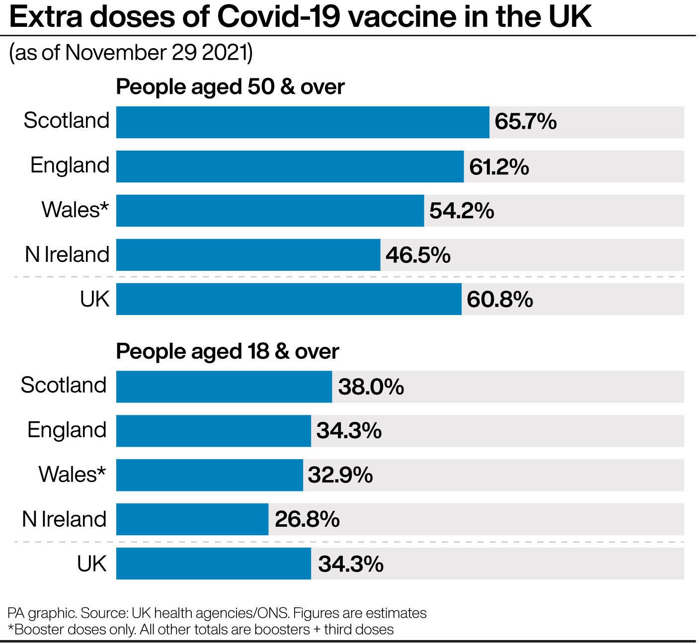 These show that 835,689 boosters had been given to those over 18 as of November 29, according to Public Health Wales – the equivalent of 32.9% of the age group.