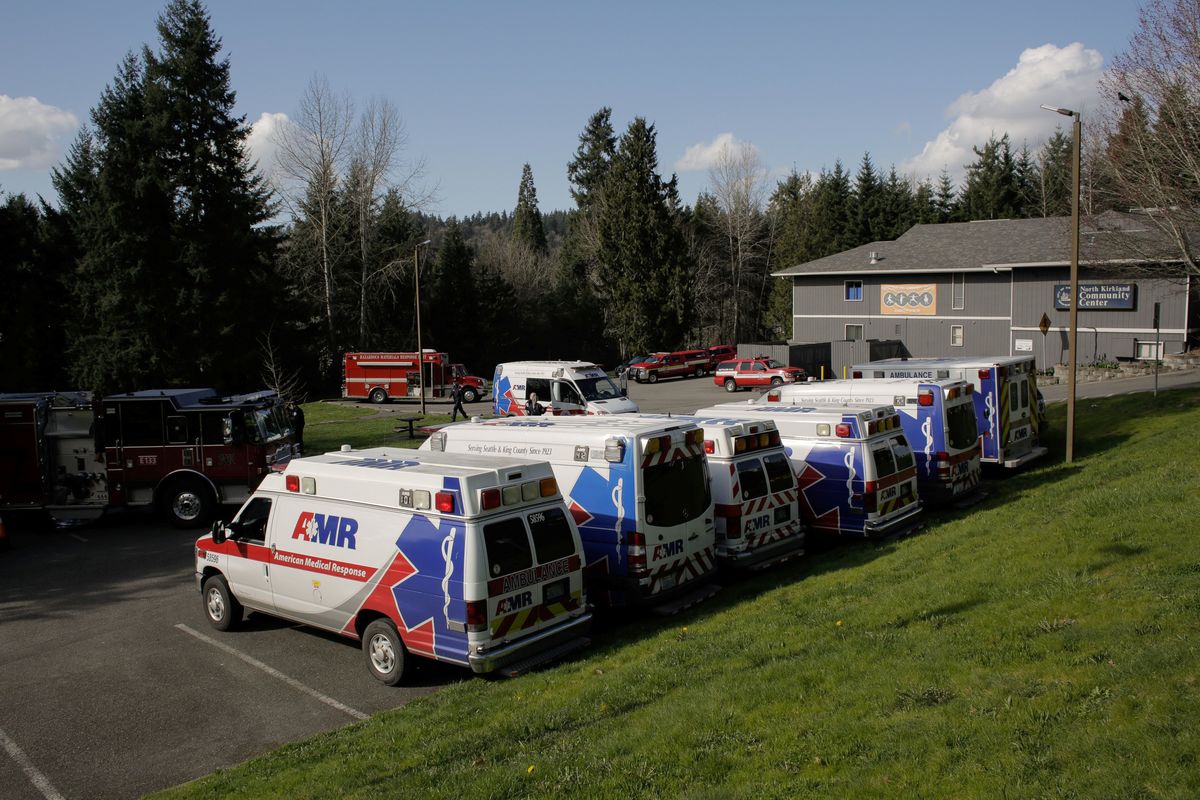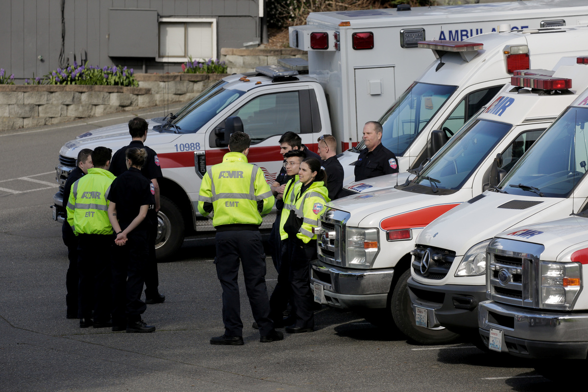 Medics wait near ambulances in a staging area at the North Kirkland Community Center, which is a short drive from the Life Care Center of Kirkland, the long-term care facility linked to several confirmed coronavirus cases in the state, in Kirkland, Washington, U.S. March 4, 2020. REUTERS/David Ryder
