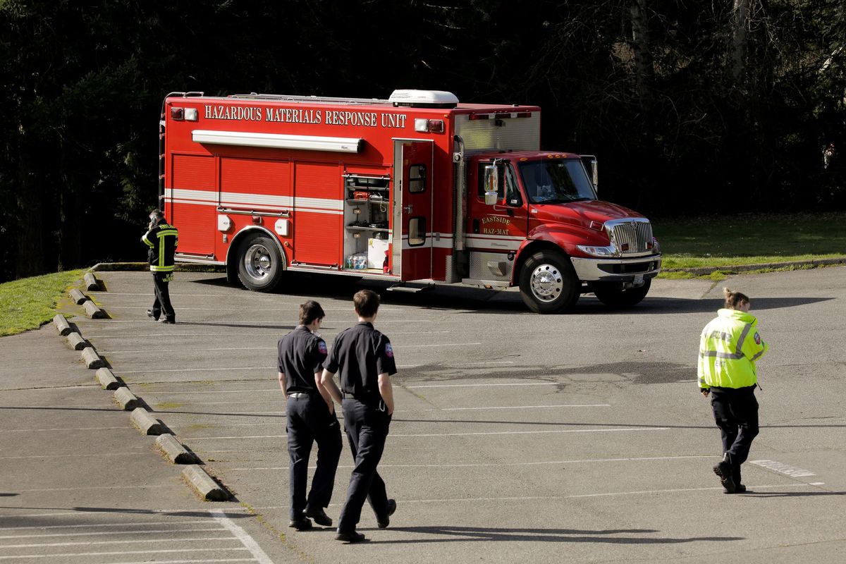 Ambulances, fire engines, a hazardous materials response unit, and other emergency vehicles are seen in a staging area at the North Kirkland Community Center, which is a short drive from the Life Care Center of Kirkland, the long-term care facility linked to several confirmed coronavirus cases in the state, in Kirkland, Washington, U.S. March 4, 2020. REUTERS/David Ryder