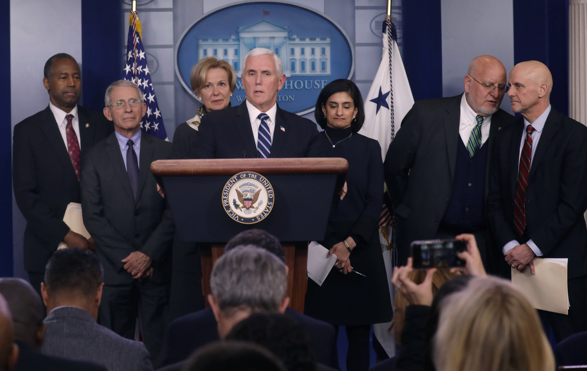 Vice President Mike Pence gives a news briefing about the coronavirus with members of the White House coronavirus task force at the White House in Washington, U.S. March 4, 2020. REUTERS/Leah Millis
