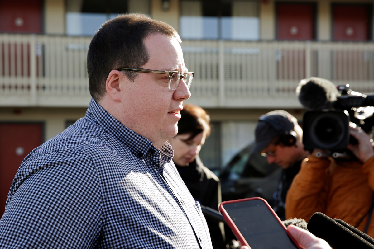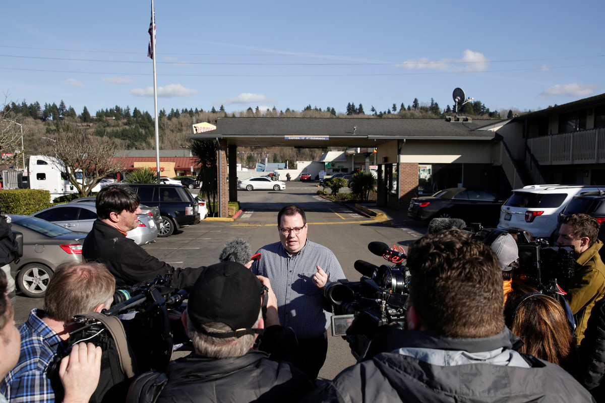 King County Deputy Communications Director Chase Gallagher addresses the media after the county announced it is buying an 85-bed Econo Lodge motel to house patients in recovery and isolation for the coronavirus outbreak in Kent, Washington, U.S. March 4, 2020. REUTERS/Jason Redmond
