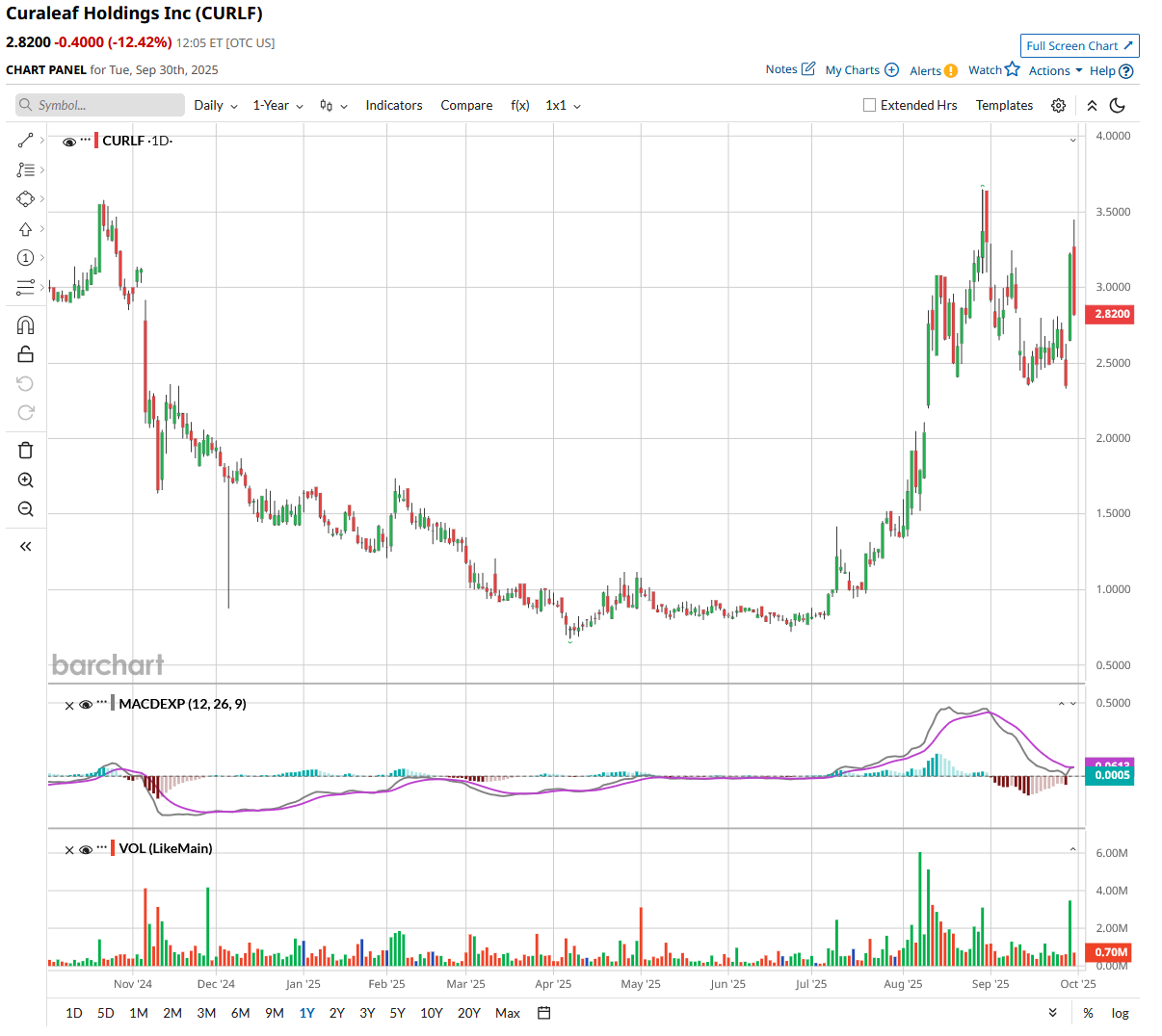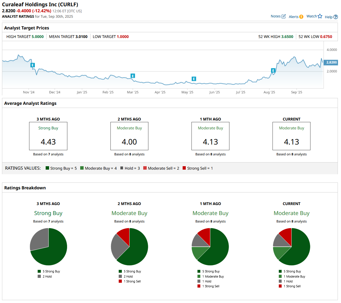 Out of the eight analysts covering CURLF stock, five recommend “Strong Buy,” one recommends “Moderate Buy,” one recommends “Hold,” and one recommends “Strong Sell.” The average CURLF stock price target is $3.01, which is 7% higher than the current price of $2.82.