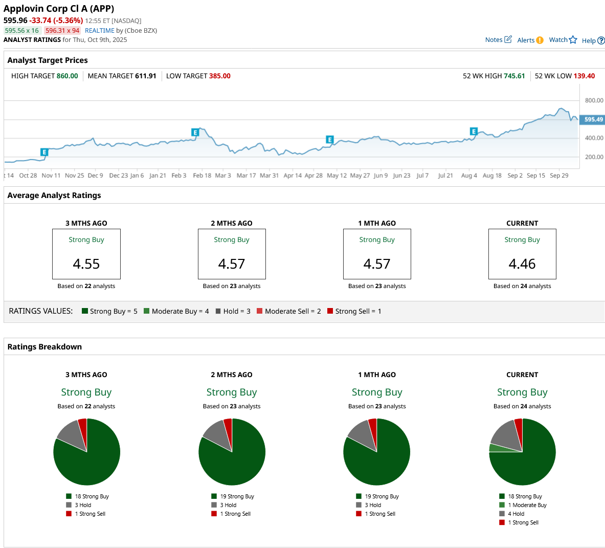 Wall Street analysts remain extremely bullish on AppLovin, with APP stock enjoying a top-tier “Strong Buy” consensus rating. Of the 24 analysts covering the stock, 18 rate it a “Strong Buy,” one a “Moderate Buy,” four suggest holding, and one assigns a “Strong Sell” rating. Following the recent rally, APP stock is trading slightly below its average price target of $611.91, though the Street-high target of $860 indicates there's still quite a lot of potential upside.