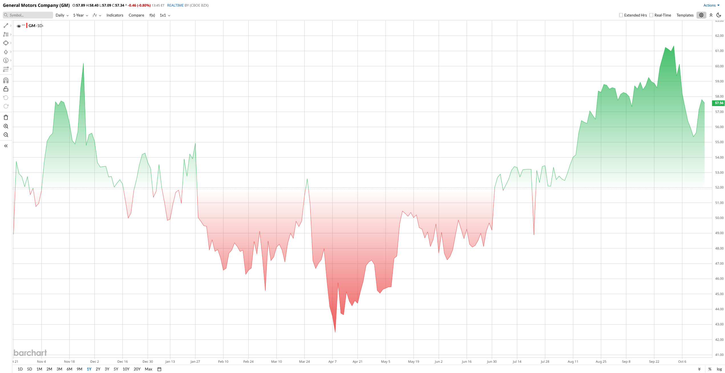 GM shares are up about 8% year-to-date (YTD) and 17% over the past year, outperforming the broader auto sector. Strong U.S. vehicle sales and a disciplined EV investment strategy have buoyed the stock. For example, GM’s robust North American pickup/SUV sales and its cash-generative internal combustion engine (ICE) business helped drive better-than-expected Q2 results.