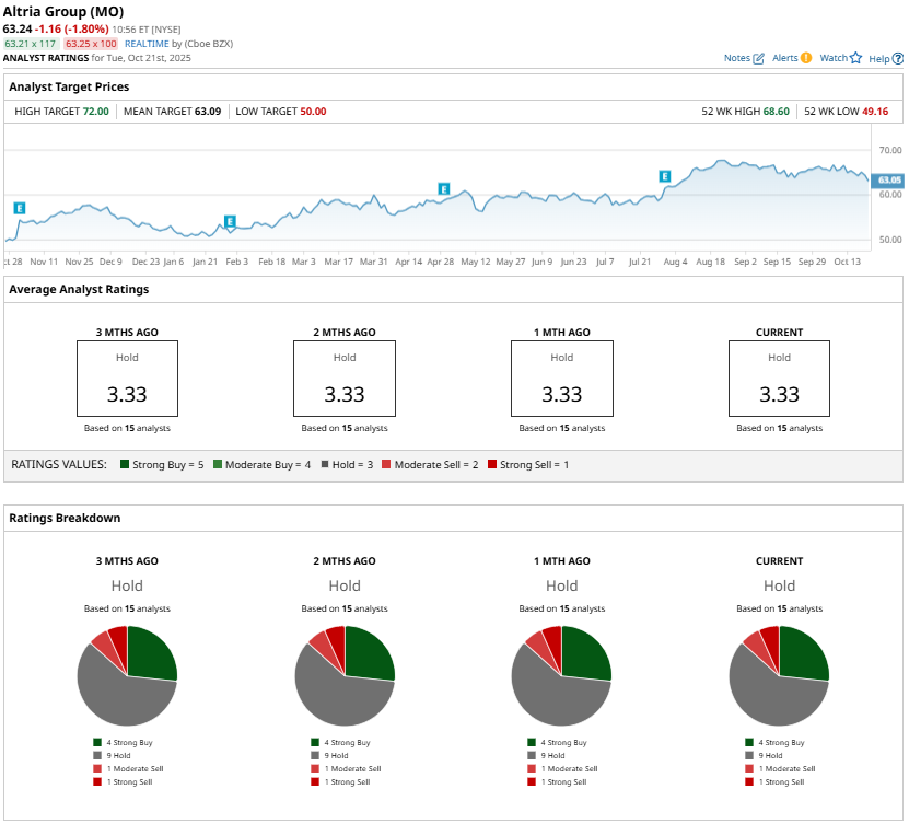 Altria is not without challenges. The declining cigarette volumes, regulatory headwinds, and evolving consumer habits all weigh on the tobacco industry. Further, Wall Street analysts currently maintain a “Hold” rating on the stock.