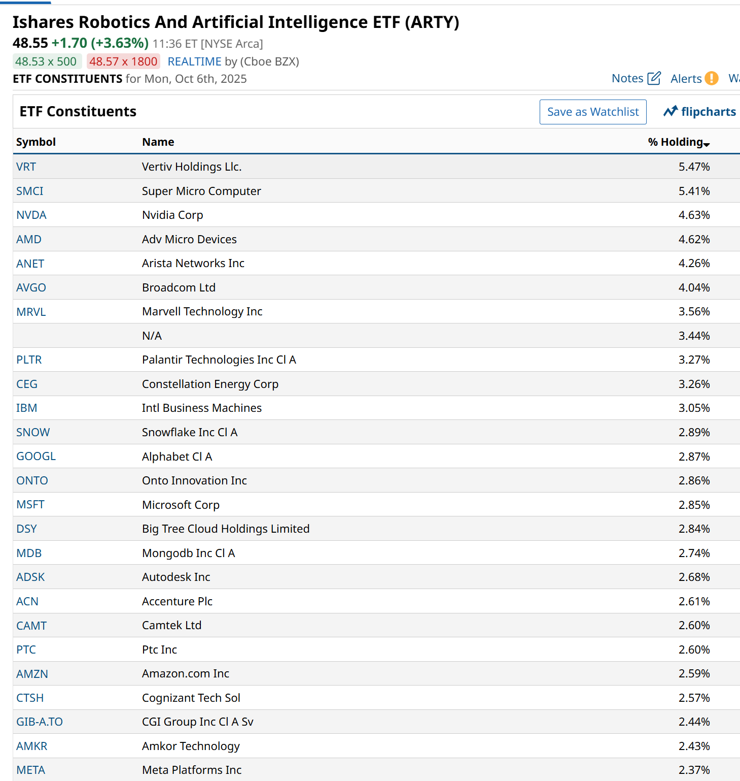 And that’s exactly what I did. Here are a few charts I like from within this basket of ARTY party favorites. Note that while this ETF includes some of the very biggest U.S. stocks, at each rebalancing and reconstitution of its benchmark, the Morningstar Global Artificial Intelligence Index, each stock that is in the ETF is capped at 4.5%. So if you see holdings above that, it means the stock is up since the last scheduled adjustment date.