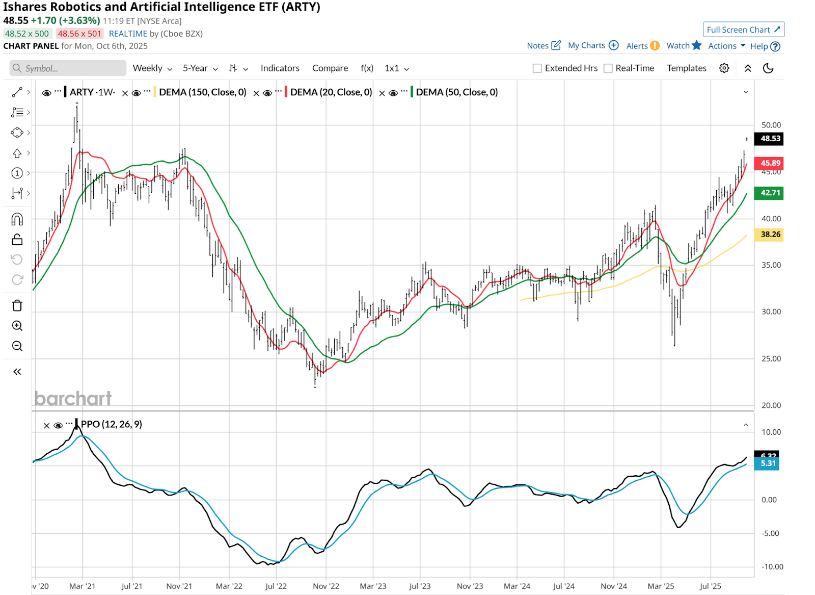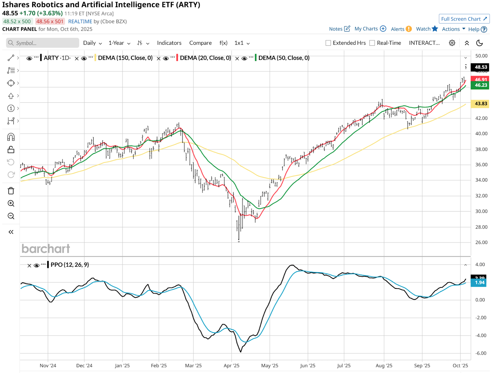 Let’s make one thing clear about the iShares Robotics and Artificial Intelligence ETF (ARTY). With a ticker symbol like that, I could have a lot of “pun” with it. Nearing a 100% up move since April, it has been the life of the “arty.”