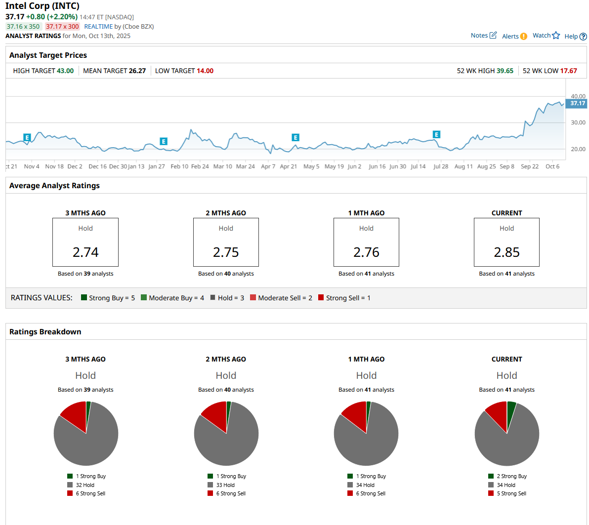 If INTC stock trades at 20 times forward earnings, which is reasonable, it should trade around $53 in early 2029, indicating an upside potential of 45% from current levels. Out of the 41 analysts covering INTC stock, two recommend “Strong Buy,” 34 recommend “Hold,” and five recommend “Strong Sell.” The average INTC stock price target is $26, below the current price of $38.
