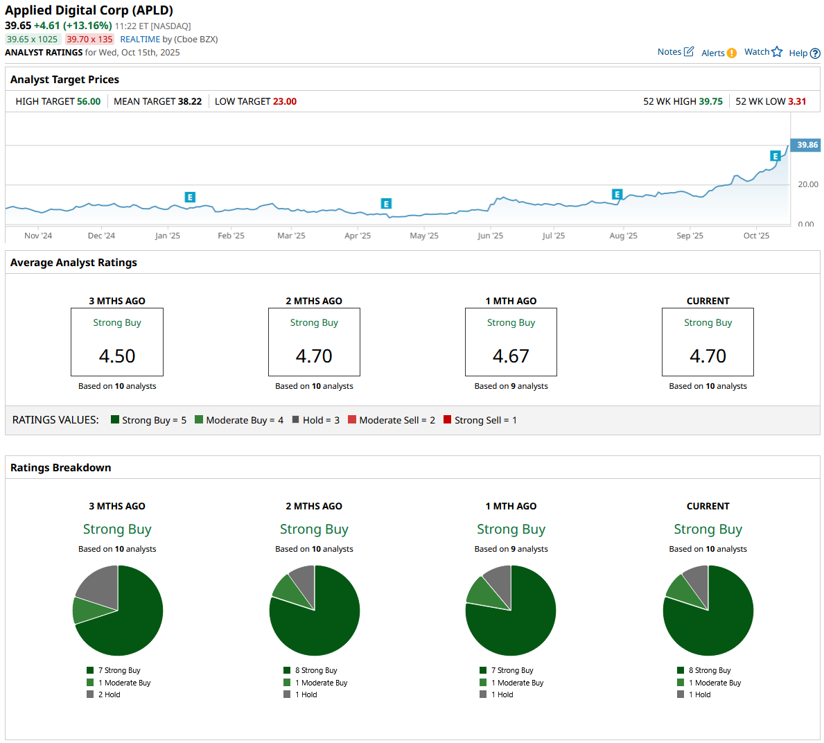 Analyst sentiment remains strongly positive. Ten analysts surveyed call for a consensus “Strong Buy” rating on APLD, showing broad conviction in the company’s future trajectory. The average price target currently sits at $38.22. That reflects an implied downside of roughly 4% from current levels.