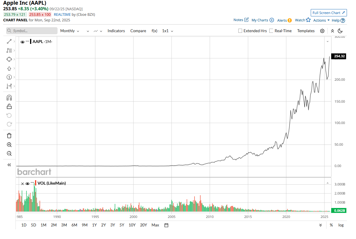 Of course, the rise of artificial intelligence (AI) and surging market capitalizations among companies in this space have changed the dynamics around how Apple is valued relative to other mega-cap tech behemoths. But it's also true that long-term investors who have stuck with this name have done screamingly well (just check out the stock price performance chart below).