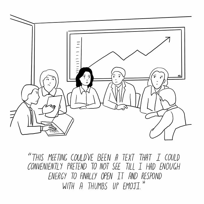 Mayanka Goel, screenwriter, copywriter, journalist, and artist from Mumbai, India, draws what we’re all thinking — but funnier. In her one-panel comics, she distills the weird, annoying, and strangely tender moments of everyday life into sharp visuals and even sharper punchlines. Whether it’s the silent tension of work meetings or the existential dread of small talk, her work is instantly recognizable and weirdly comforting.