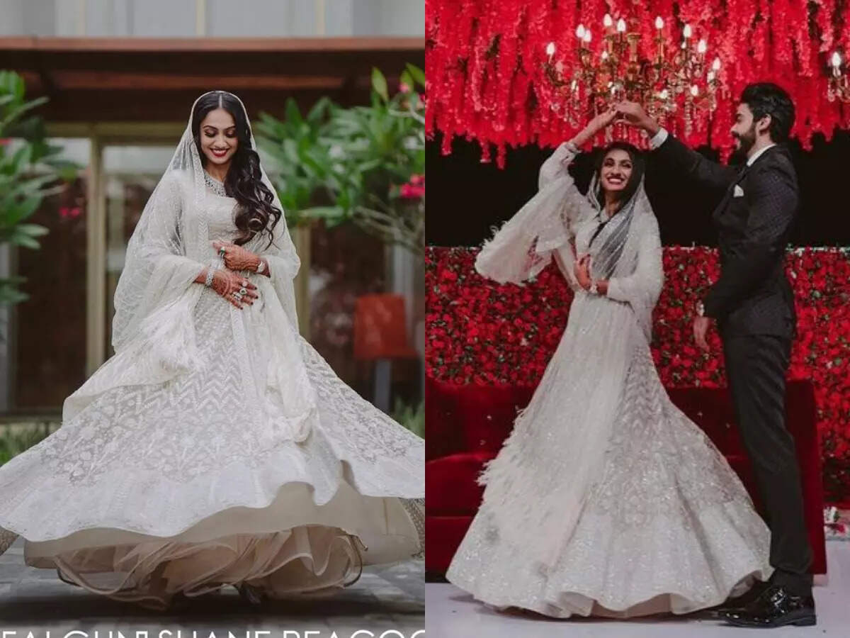 Real bride Renna Noushad, who's a chef from UAE picked up a raher exclusive lehenga for her D-day. Defying the myth that shimmer works best only for an evening do, Renna Noushad chose a beautiful ivory, crystals encrusted lehenga for her day wedding and looked every bit gorgeous in it. The couture ensemble by designer duo Falguni Shane Peacock was replete with floral details that had Swarovski stones, beads and crystals embedded in them. She styled the lehenga with diamond and emerald jewellery, that added to the overall glint of the look.