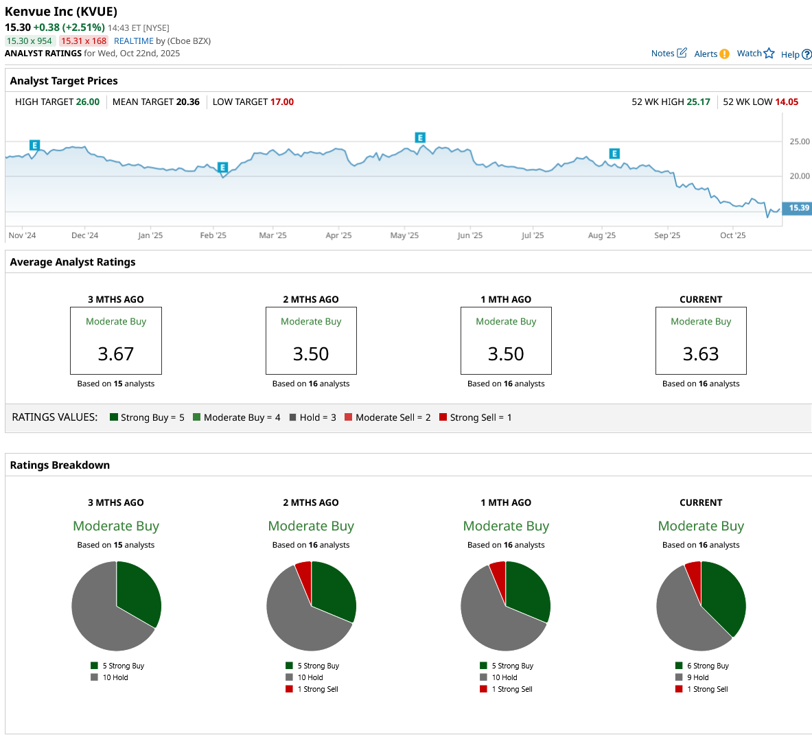 Out of the 16 analysts covering KVUE stock, six recommend “Strong Buy,” nine recommend “Hold,” and one recommends “Strong Sell.” The average KVUE stock price target is $20.36, indicating an upside potential of 35% from current levels.