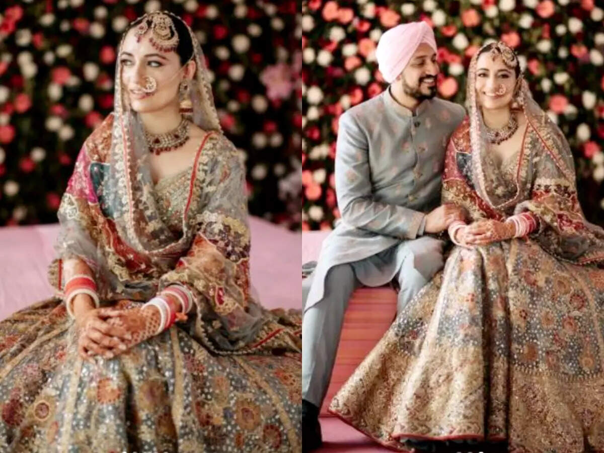 Bride Avisha Chaudhary wore a dove grey tulle and silk lehenga for her Anand Karaj ceremony. The lehenga by designer duo Rimple and Harpreet featured floral motifs derived for an archival 18th century carpet, an amalgamation of various crafts.