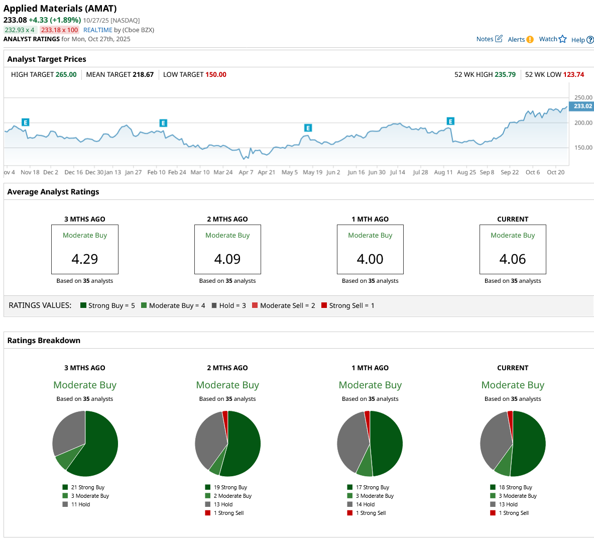 Out of the 35 analysts covering AMAT stock, 18 recommend “Strong Buy,” three recommend “Moderate Buy,” 13 recommend “Hold,” and one recommends “Strong Sell.” The average AMAT stock price target is about $219, below the current price of $233.