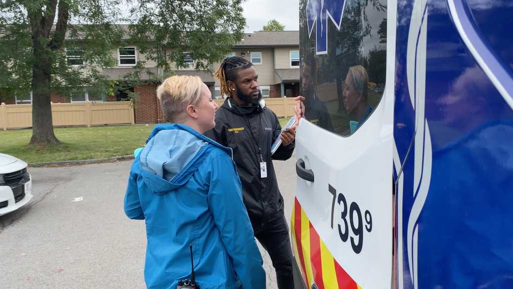 Brean and Johnson head to the scene. Once they arrive, they have to wait for the police before they approach. When they do, the team works in tandem with them. Johnson tries to arrange a ride home for a woman in distress, while Brean takes care of the children who were playing on the street. They go between the police and the ambulance drivers before she is eventually taken to hospital.