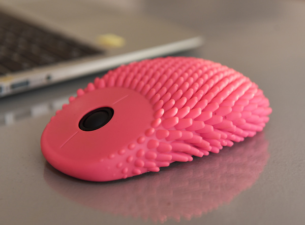 The multi-sensory fidget mouse is covered in a silicon body with nubs all around it that help children grip the device. The hoglet is wireless and minimizes clicking sounds as to not irritate those with autism spectrum disorder.
