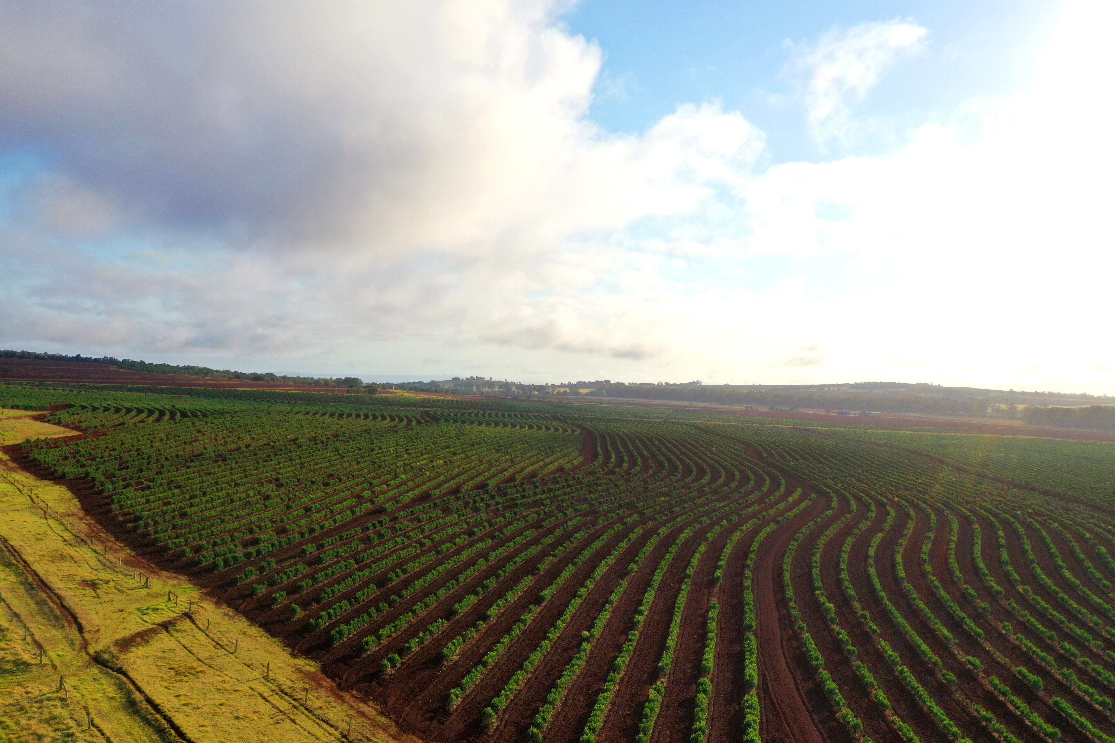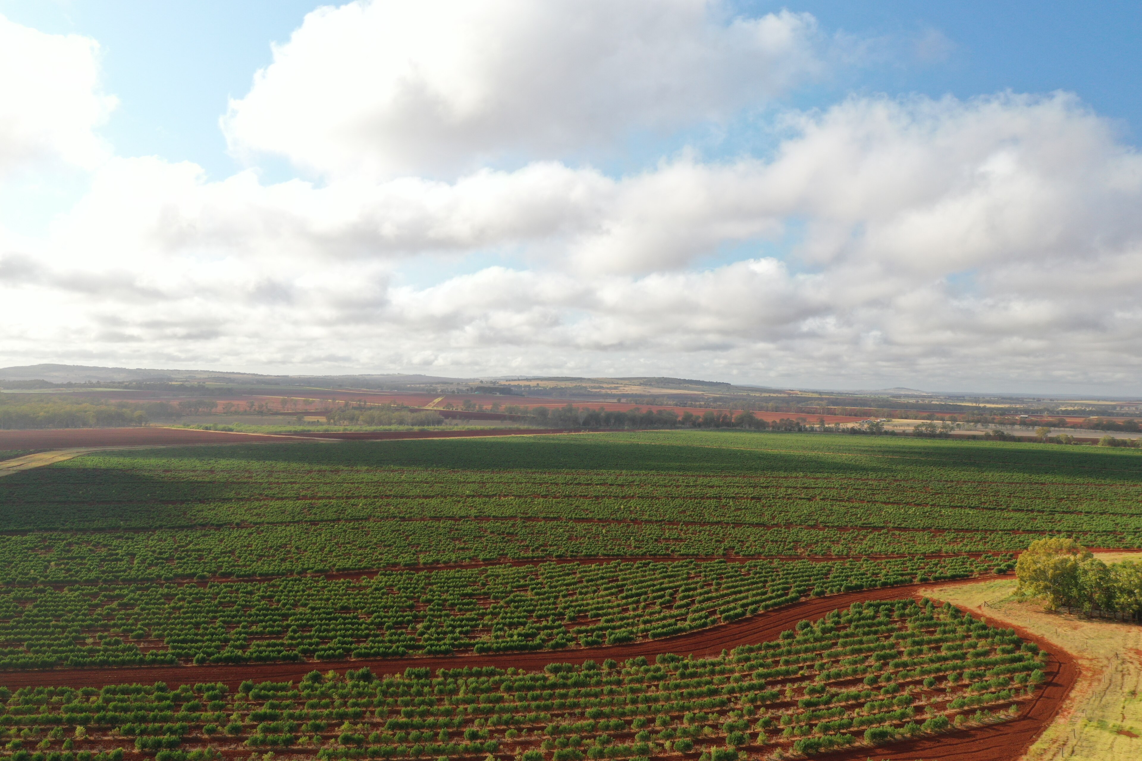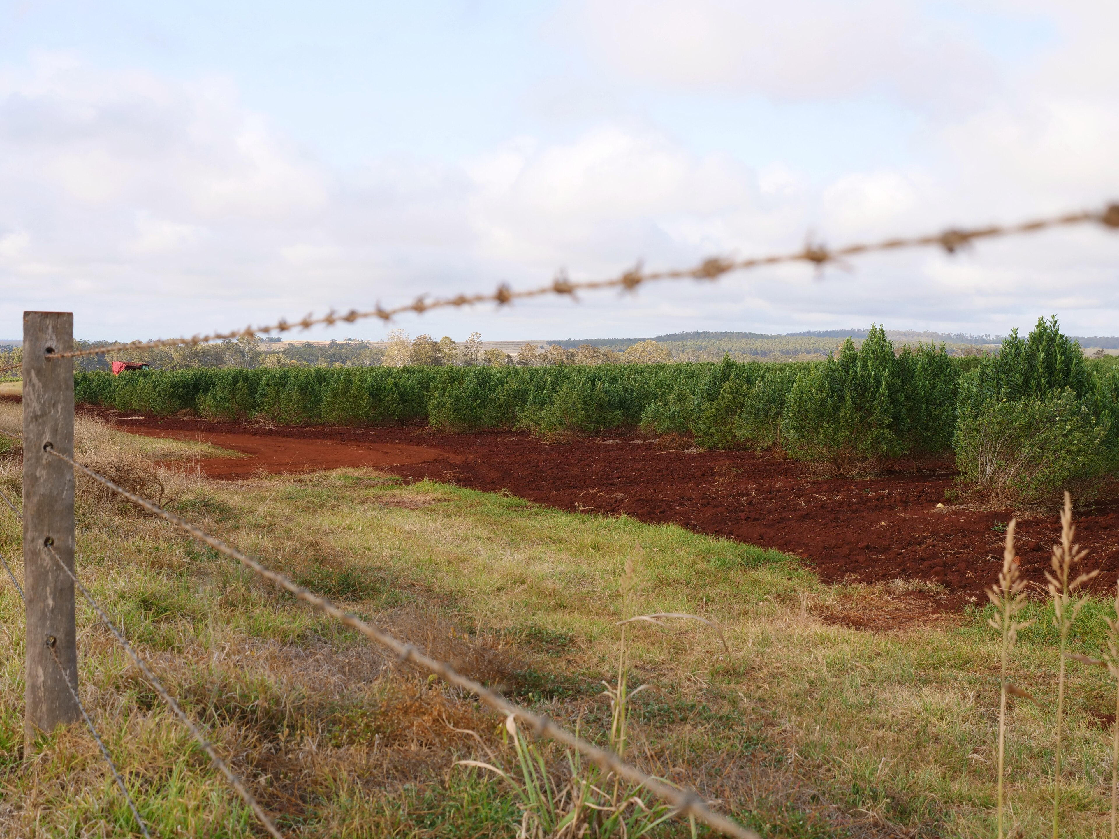 The winding rows of native Duboisia shrubs snake through red volcanic soils on a massive scale.
