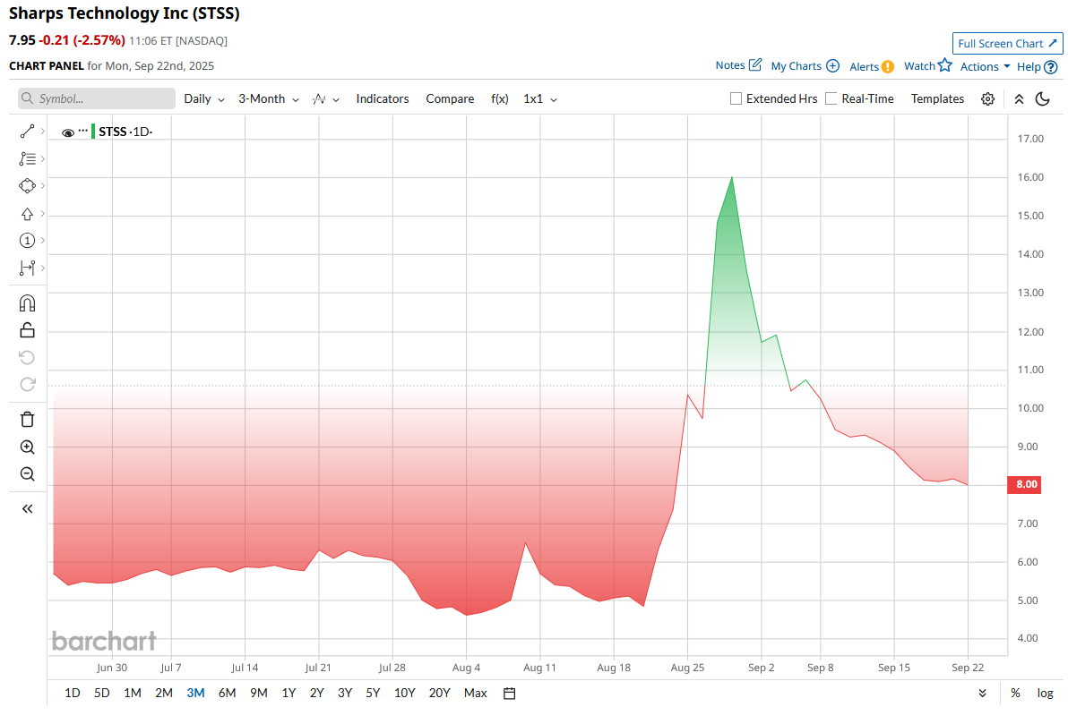 With a market cap of just $209 million, Sharps Technology has quickly become one of 2025’s most volatile small-cap names, trading almost tick-for-tick with crypto sentiment. Shares exploded 70% in a single session after the company unveiled its $400 million Solana treasury raise, spiking to nearly $13 intraday before sliding back to around $8 by Sept. 19. Earlier this year, the stock languished between $3 and $5. Even after the recent fireworks, however, STSS remains down nearly 99% from its speculative peaks last year.