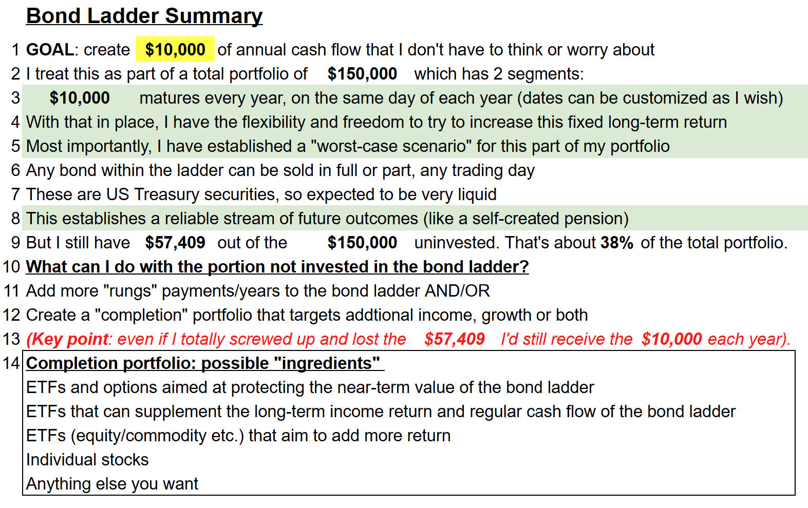 I also created for my club members this plain-language guide, to walk them through it step by step. The yellow figure can be changed in the live sheet, to vary the amount of annual cash flow from bond maturities. The other figures can naturally be adjusted as well.