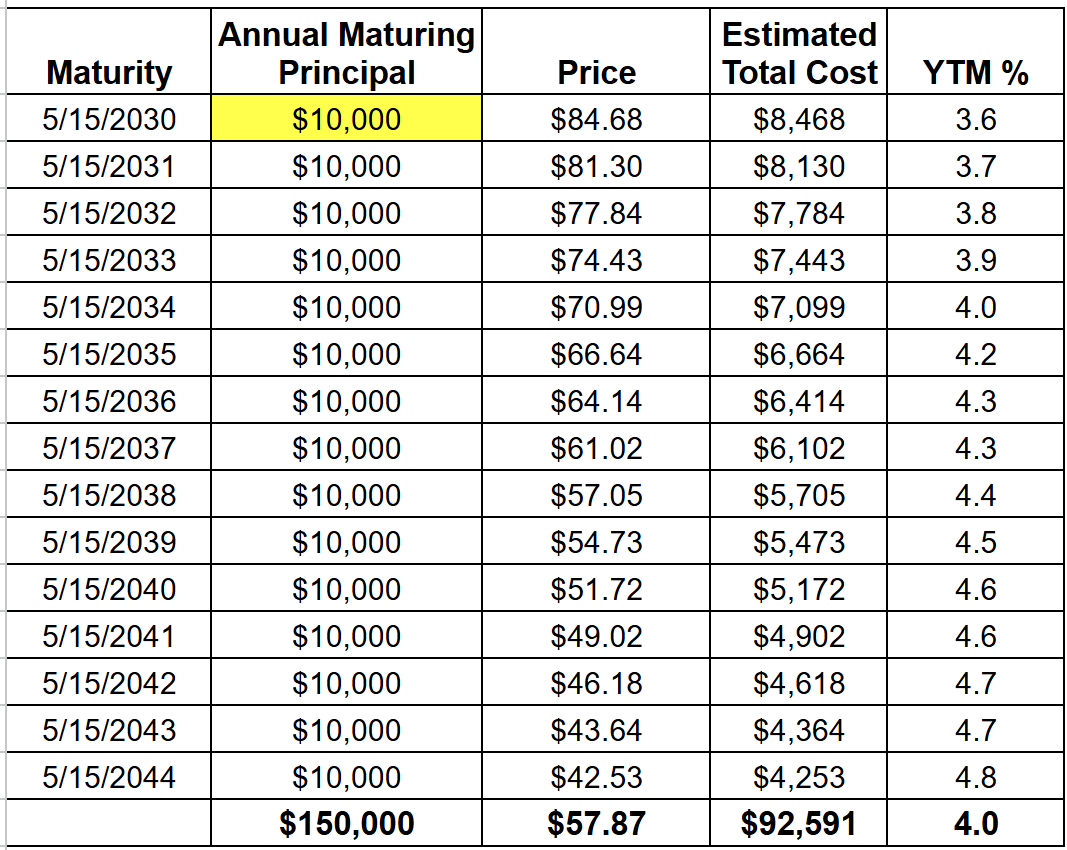 The idea is to have money coming due every year. Sort of like an annual or quarterly check. In my example, I am using zero-coupon U.S. Treasury securities. But bond ladders can also be created with bonds that pay coupon income.