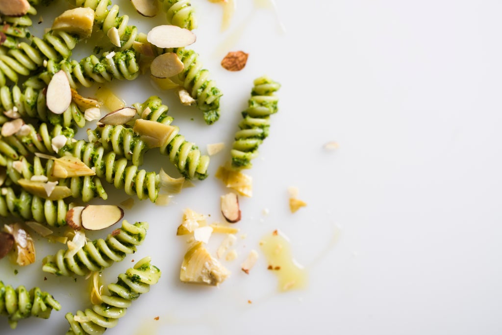We were inspired by one version of pesto we saw in “Autentico” by Rolando Beramendi. This Tuscan cook combines bitter herbs and greens with garlic and marinated artichoke hearts into a vegan sauce that pairs beautifully with chunky pasta shapes such as fusilli.