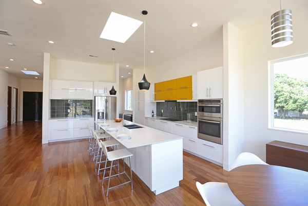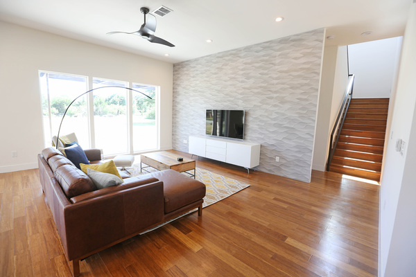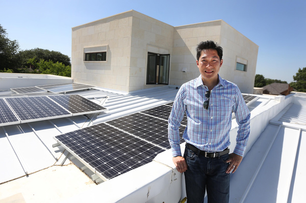 Inside, his Frisco prototype has modern kitchen fixtures and appliances, LED lighting and engineered bamboo floors. A patio cover outside the great room doors will be covered in more solar panels.