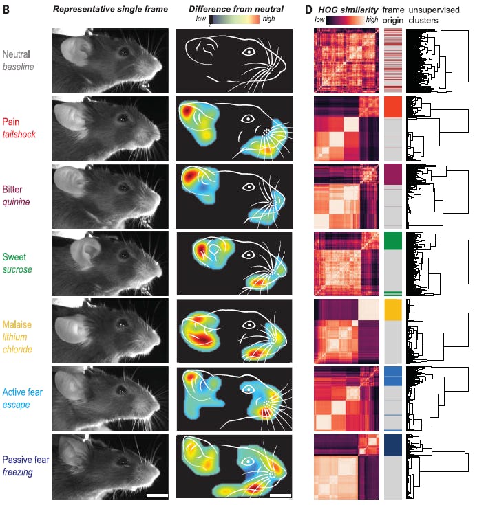 In the study, published Friday in the journal Science, the authors began exploring these questions by learning how mice would emotionally respond to different sensory stimuli. To see a range of emotional responses, the team exposed the mice to stimuli such as sweet and bitter tastes and painful tail shocks to stimulate emotions like pleasure, disgust or fear. After receiving this stimuli, or "emotional events," the mice reacted with visible facial responses. However, the authors write that human observation of these differences can be tedious and subjective.