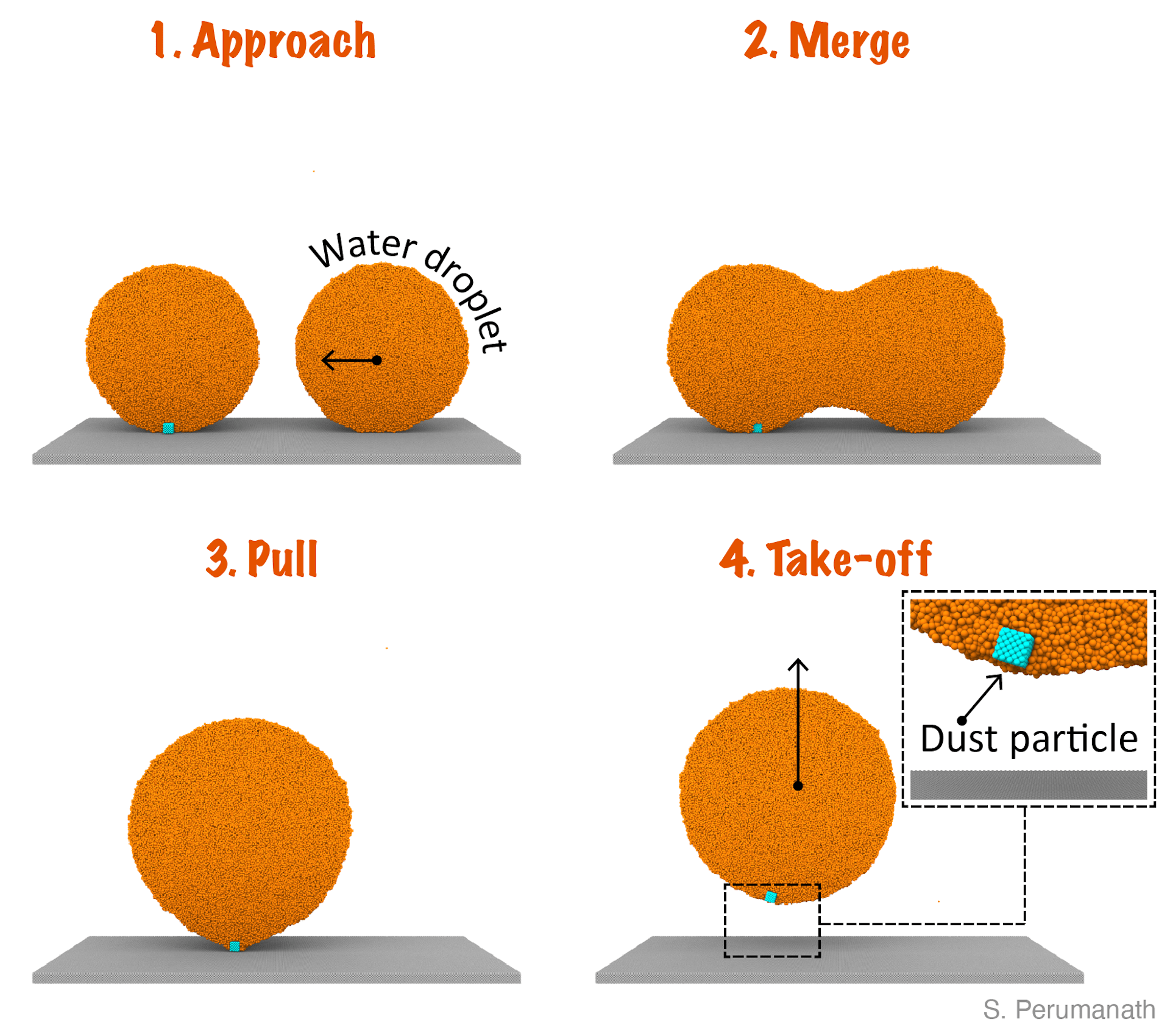However, until now, how smaller droplets, which are too small to be pulled by gravity, picked up dirt remained elusive. We found that small droplets, over time, will merge with their neighbors.