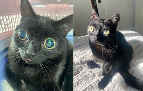 After Mia found Jinx in a field in 2018, she took the kitten in and started sharing photos online. Mia says that despite the birth defects that cause the cat’s jarringly massive eyes and feet, the vet says she’s healthy. All hail mayor Jinx!