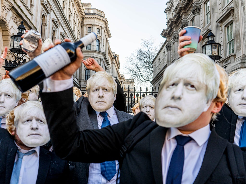 Dozens of people wearing Boris Johnson masks and wigs danced outside Downing Street after details emerged of more parties held amid strict Covid rules on the eve of Prince Philip's funeral last year.