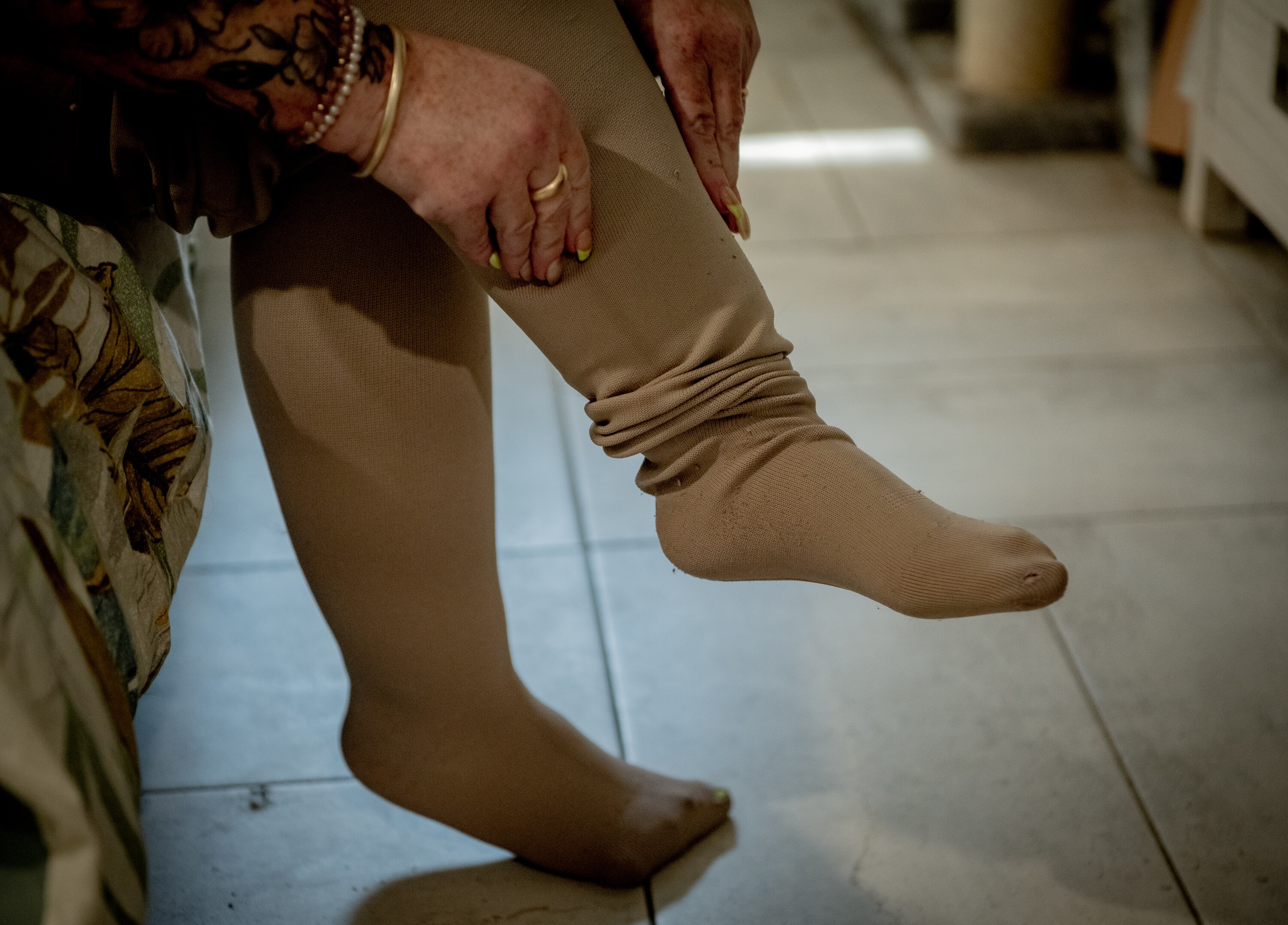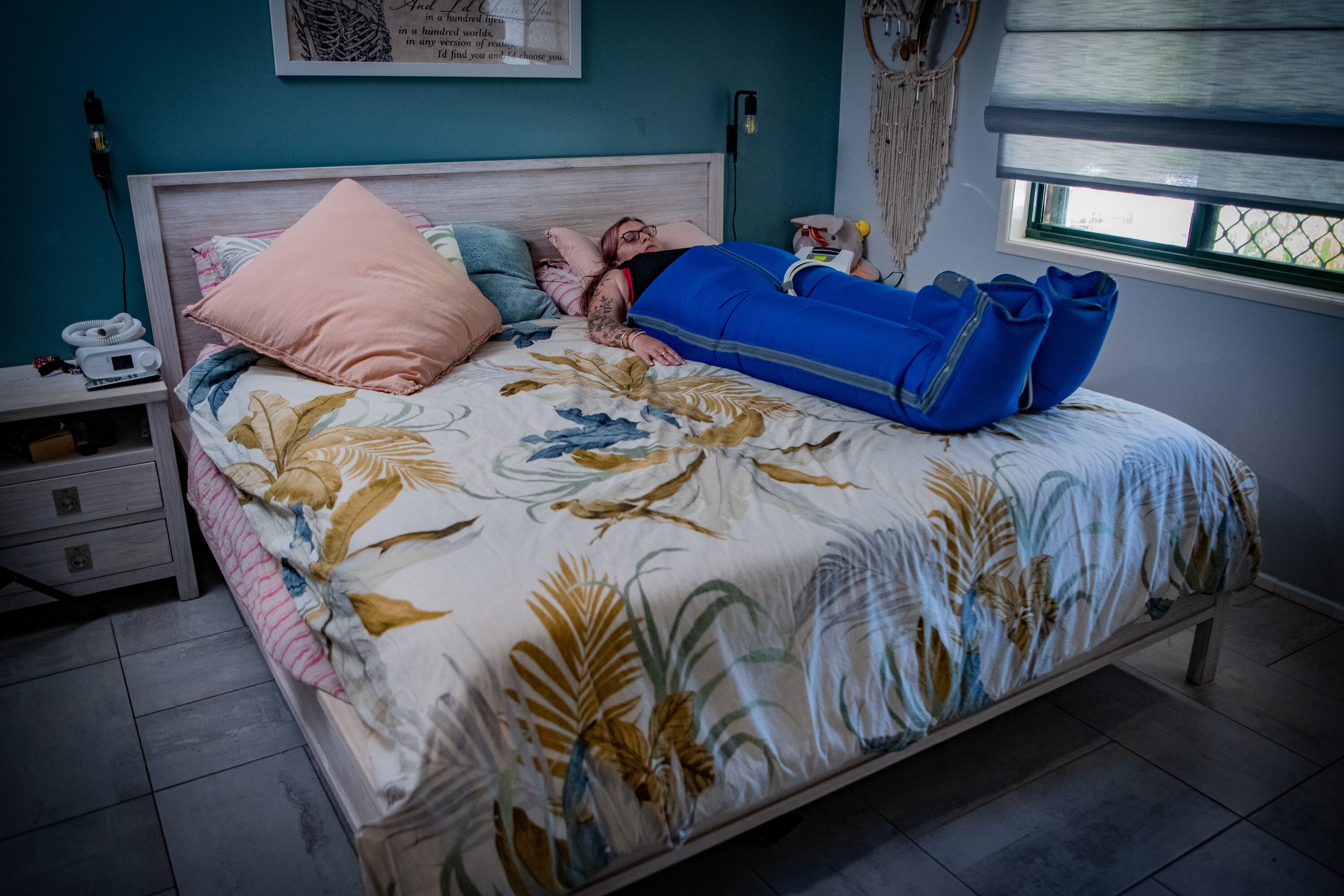 Full-body compression garments, a compression pump suit she lays in for an hour each day, massages and regular pain medication are now part of her daily ritual.