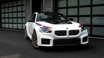 Finished in Alpine White, the M2 Turbo Design Edition features hand-painted BMW Motorsport stripes front and rear. The signature tricolor design wraps around the hood and lines the trunk lid, with an offset stripe running the length of the carbon fiber roof from front to back.