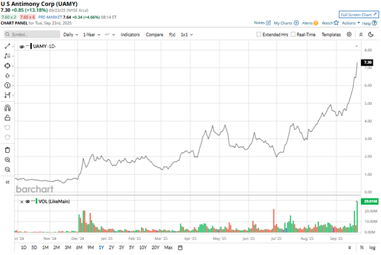 Against this backdrop, small-cap natural resource company United States Antimony (UAMY) secured a five-year sole-source contract worth up to $245 million from the U.S. Defense Logistics Agency, further solidifying its growing partnership with the Department of Defense. UAMY stock surged more than 13% intraday on the news.