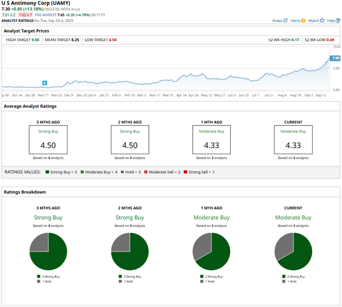 Wall Street analysts are soundly bullish on UAMY stock, with a consensus “Moderate Buy” rating overall. Of the three analysts rating the stock, two analysts give a “Strong Buy” rating while one analyst has a “Hold” rating. The consensus price target of $9.08 represents 15% upside from current levels. The Street-high price target of $9.75 points to 24% potential upside from current levels.