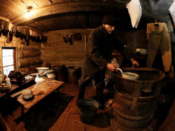 He keeps warm with a wood-burning stove and draws water from a barrel.