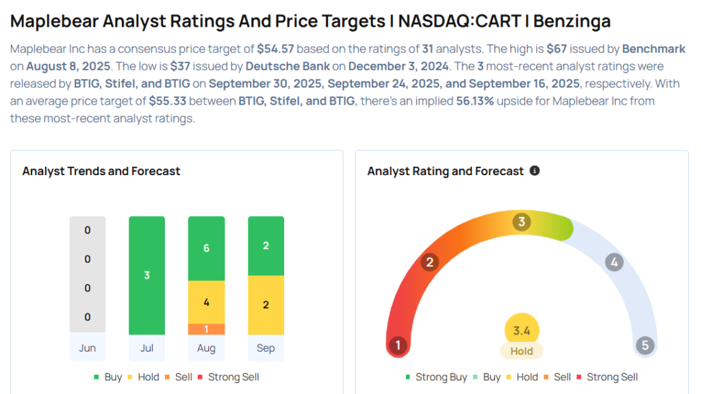 - BTIG analyst Jake Fuller downgraded the rating for Maplebear Inc. (NASDAQ:CART) from Buy to Neutral and maintained the price target of $55. Maplebear shares closed at $37.92 on Monday. See how other analysts view this stock.