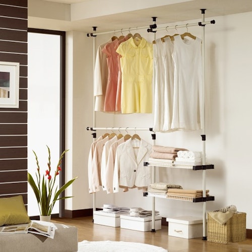 Putting it together was relatively easy. I just followed the instructions, conjoined the various metal poles and plastic fasteners, and wedged the spring-loaded endings to the floor and ceiling. Altogether, it took around an hour — far less time than I spent color coordinating everything it would hold. It’s adjustable, so it was able to fit perfectly alongside my dresser.