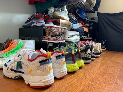 Inside, there’s the ubiquitous IKEA Malm 4-drawer chest packed with socks, underwear, and bottoms. The equally familiar IKEA Kallax is half-dedicated to apparel — one cube stacked with t-shirts, the other with even more pants. My closet, 38 inches wide as measured by the Supreme tape measure, is where outerwear claims the hangers and two suitcases, a pair of storage bins, several sneaker boxes, and the Off-White x IKEA paper bag all pile up, filled to capacity with various garments. Unboxed shoes are lined up underneath my desk and bed frame, the latter of which also hides an additional suitcase and four more storage bins. Prior to entering, you’d be forgiven for missing two shoe racks and a standing coat hanger that are solely mine, not shared with my roommate.