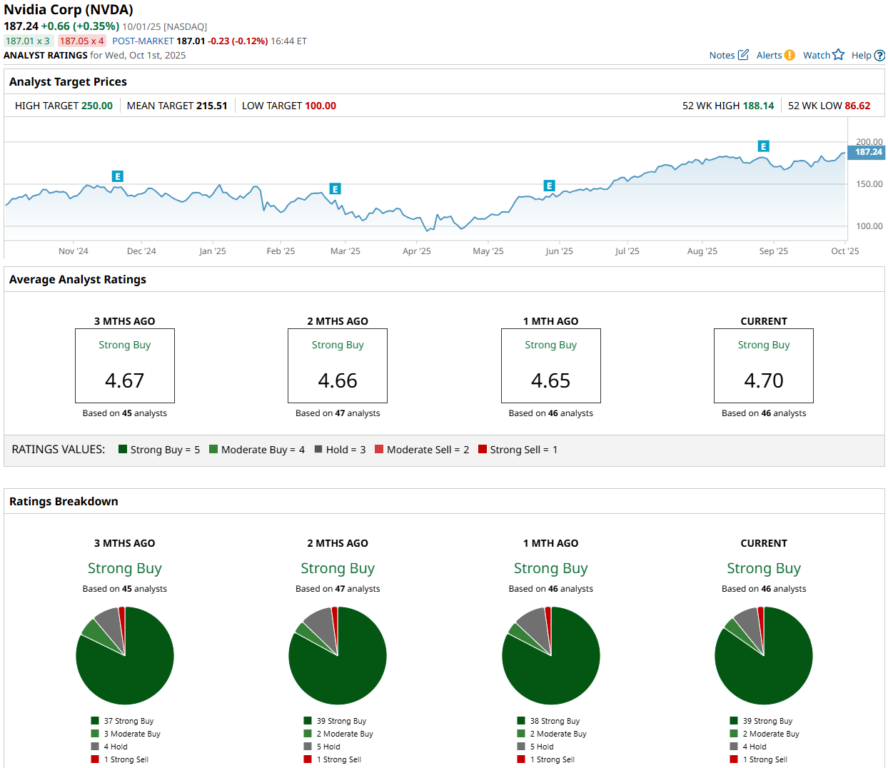 Wall Street analysts remain highly optimistic about NVDA, as the stock has a top-tier consensus “Strong Buy” rating. Out of the 46 analysts covering the stock, 39 rate it a “Strong Buy,” two a “Moderate Buy,” four suggest holding, and one gives it a “Strong Sell” rating. The average price target for NVDA stock stands at $215.51, implying a 15.1% upside from current levels.