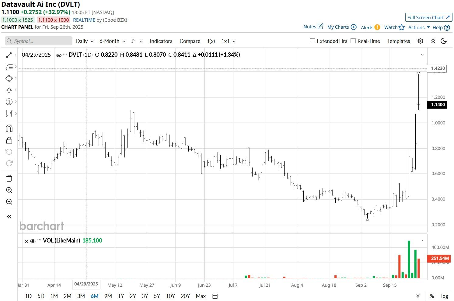 Following the explosive rally, DVLT stock is trading nearly 350% higher than its Sept. 4 low.