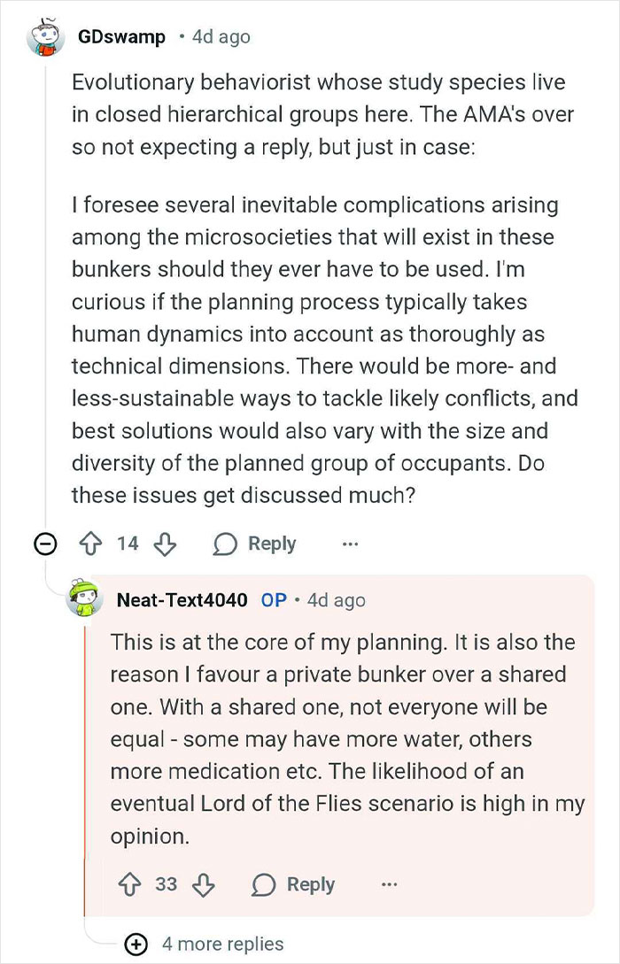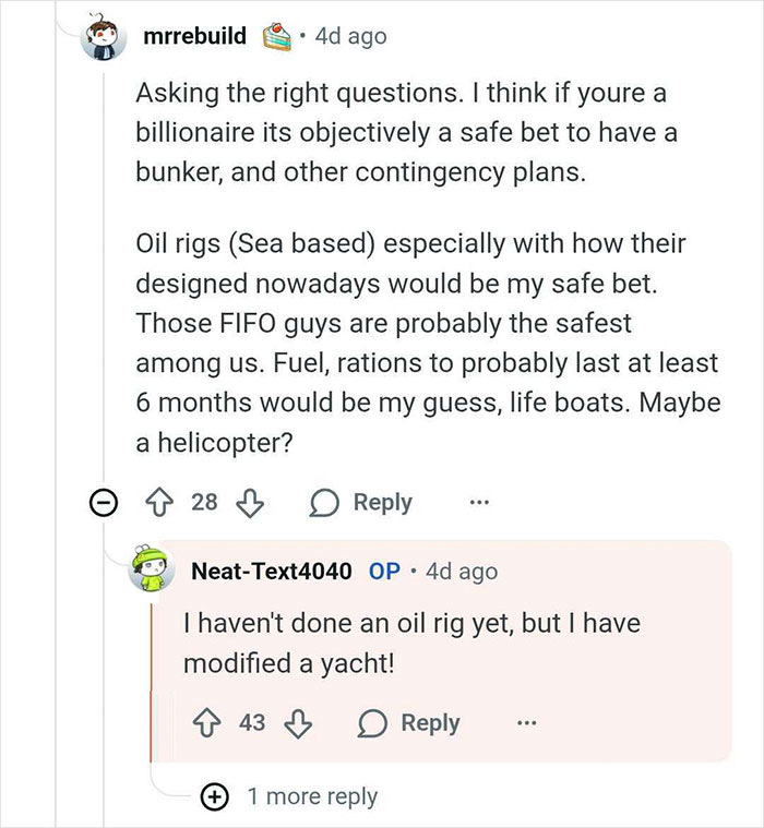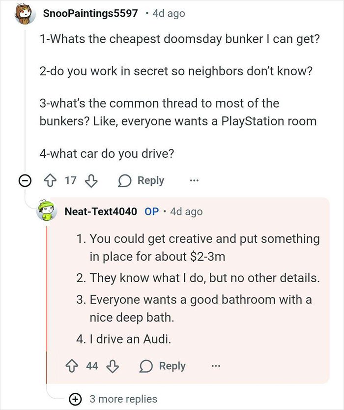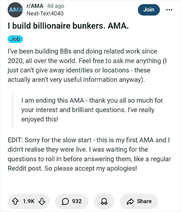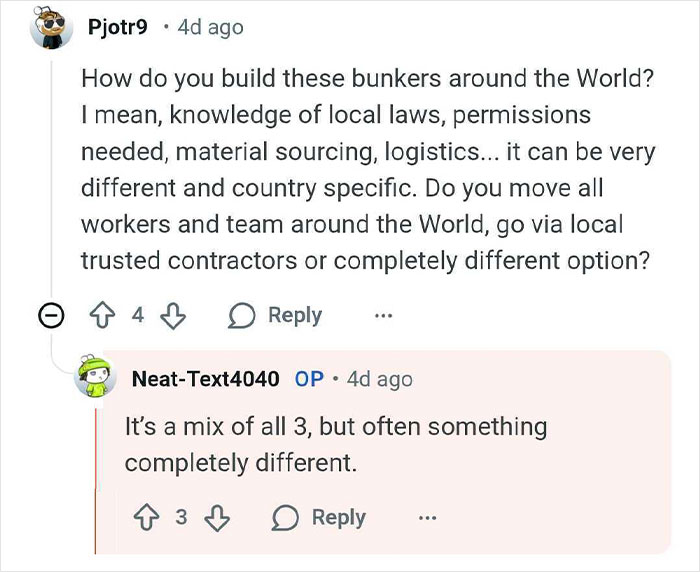 The billionaire bunker builder told us that they didn't expect their AMA thread to get much interest, as the topic was quite niche. However, it has "attracted so much interest, and I’ve honestly learned things from the amazing Redditors I spoke with," u/Neat-Text4040 told Bored Panda.