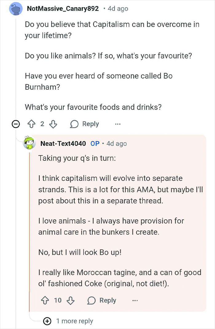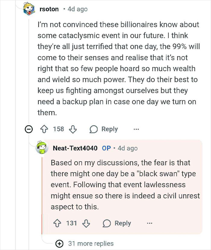 "I did the AMA because I thought people would enjoy reading about it. I think perhaps it resonated with people because we live in uncertain times (conflicts and pandemic contributed to this) and times of great inequality, so preparedness plans for the super rich are pretty interesting right now," they said, sharing the inspiration behind the thread.