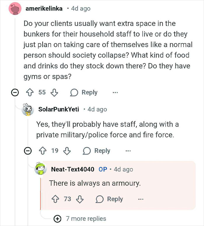 "Building bunkers isn’t actually the main way the super rich prepare for disaster. There are other preparedness plans they request and this is usually my main focus," u/Neat-Text4040 told Bored Panda.