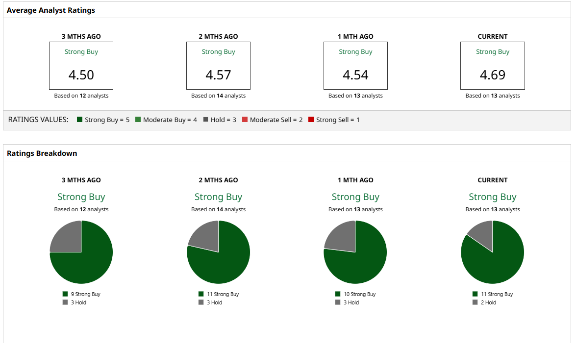 Even after a rally of more than 70% year-to-date, analysts have maintained a “Strong Buy” rating for GLW stock. Among 13 analysts, a “Strong Buy” recommendation comes from 11 analysts and two call for a “Hold” rating.