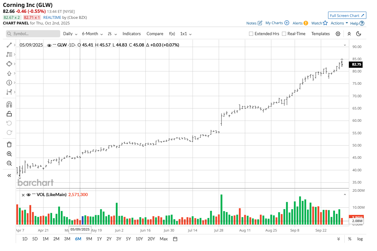 Corning (GLW) stock has been in the thick of the trading action in 2025 with a sustained rally, and shares are up more than 70% in the year to date so far. As the market continues to focus on attractive AI-related stories, Corning will benefit from AI-driven fiber growth. Further, other emerging business makes Corning among the hottest picks-and-shovels bets on artificial intelligence. As an example, the company expects its solar business to deliver $2.5 billion in revenue by 2028.