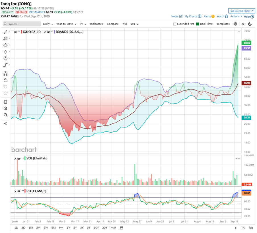 But the chart is starting to raise eyebrows. IONQ stock now trades well above its upper Bollinger Band, flashing signs of being stretched far beyond recent trends. Adding to that, the 14-day RSI has spiked to 85 — its most overbought level of this year. Momentum is clearly on IonQ’s side, but history shows these kinds of extreme technical readings often come before a breather or pullback.