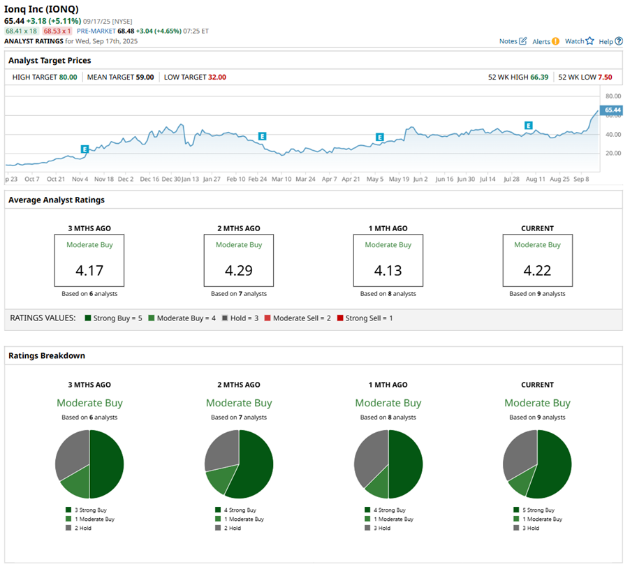 IONQ stock has a consensus “Moderate Buy” rating overall. Out of nine analysts covering the quantum computing stock, five advise a “Strong Buy,” one recommends a “Moderate Buy,” and three analysts sit on the sidelines with a “Hold” rating.